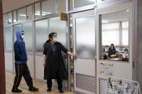 2年菊組の前の廊下に不審者が現れる設定での訓練です。不審者役の教員が廊下を通りかかると、それに気づいた担任の先生は即座に廊下へ出て対応しました。