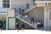 今度は子どもたちが運動場へ避難します。教頭先生の放送で、全校児童が一斉に運動場に集まりました。