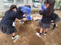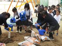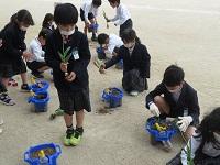 2年生が生活科の授業で3時間目に、現在一人一鉢に植えているチューリップの球根をぬきました。4月の間、学校で色とりどりの花を咲かせてくれていたチューリップも、花期を終えたので、次の夏野菜植えのための準備をしました。