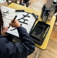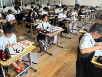 書写では、筆順と字形に気を付けながら「左右」の文字を書きました。筆順や字形が違うことをとらえ、手本をじっくり見ながら一筆一筆丁寧に書きました。