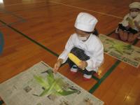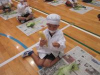 次に、トウモロコシの皮のむき方について説明があり、皮むきに挑戦! ひげまで丁寧にむいていました。